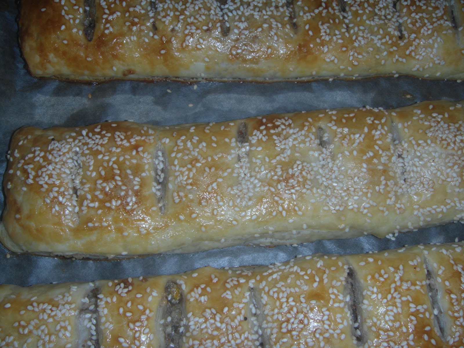 Выложить на смазанный маслом противень, выложить рулеты, надрезать порционно, и в каждый надрез налить немного масла.